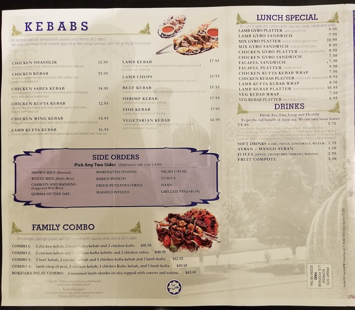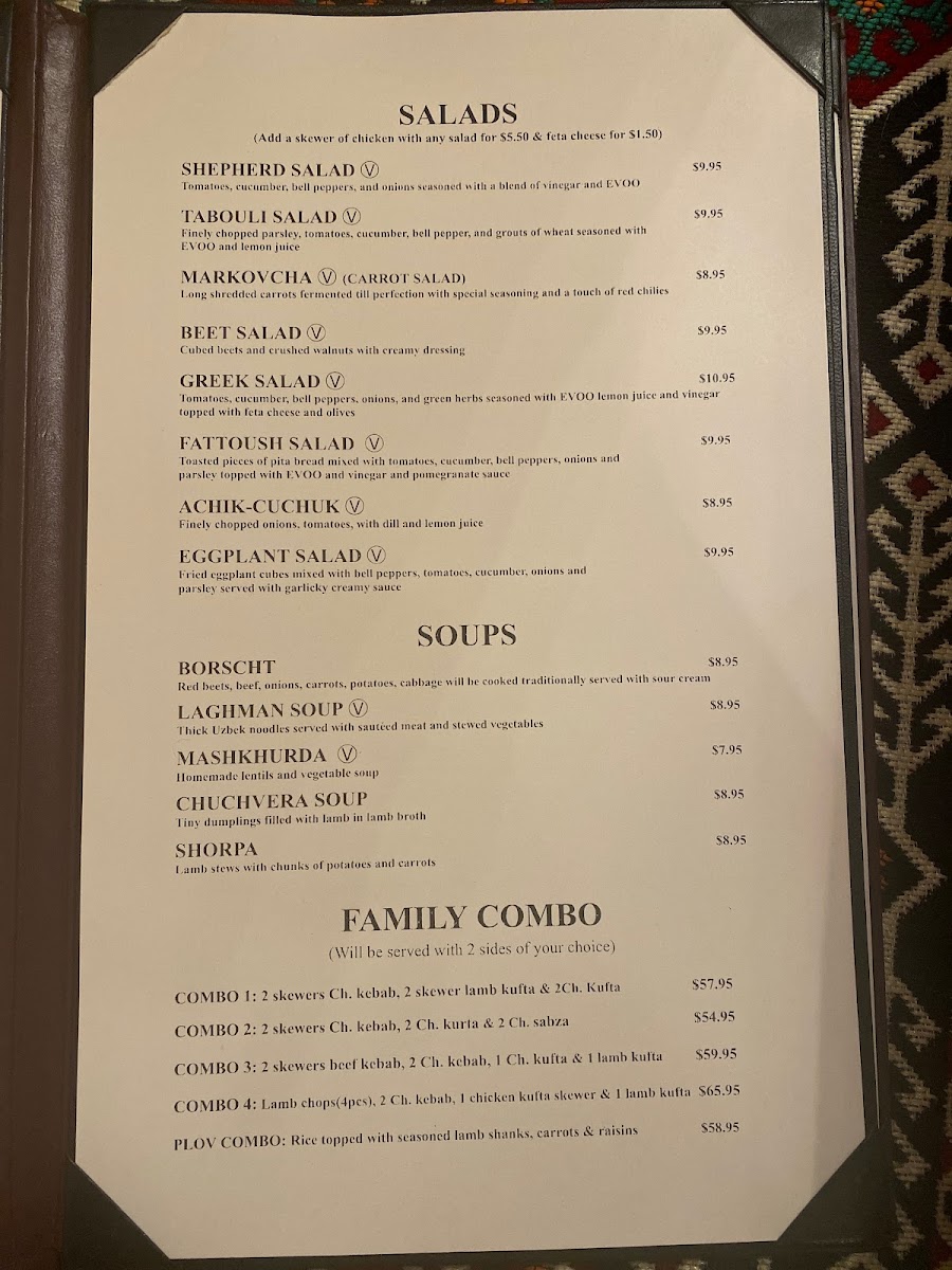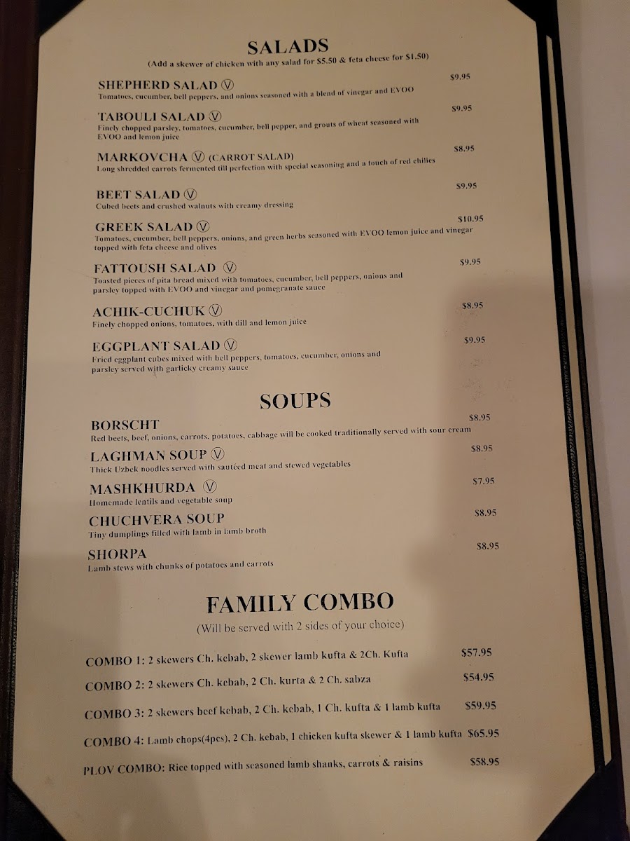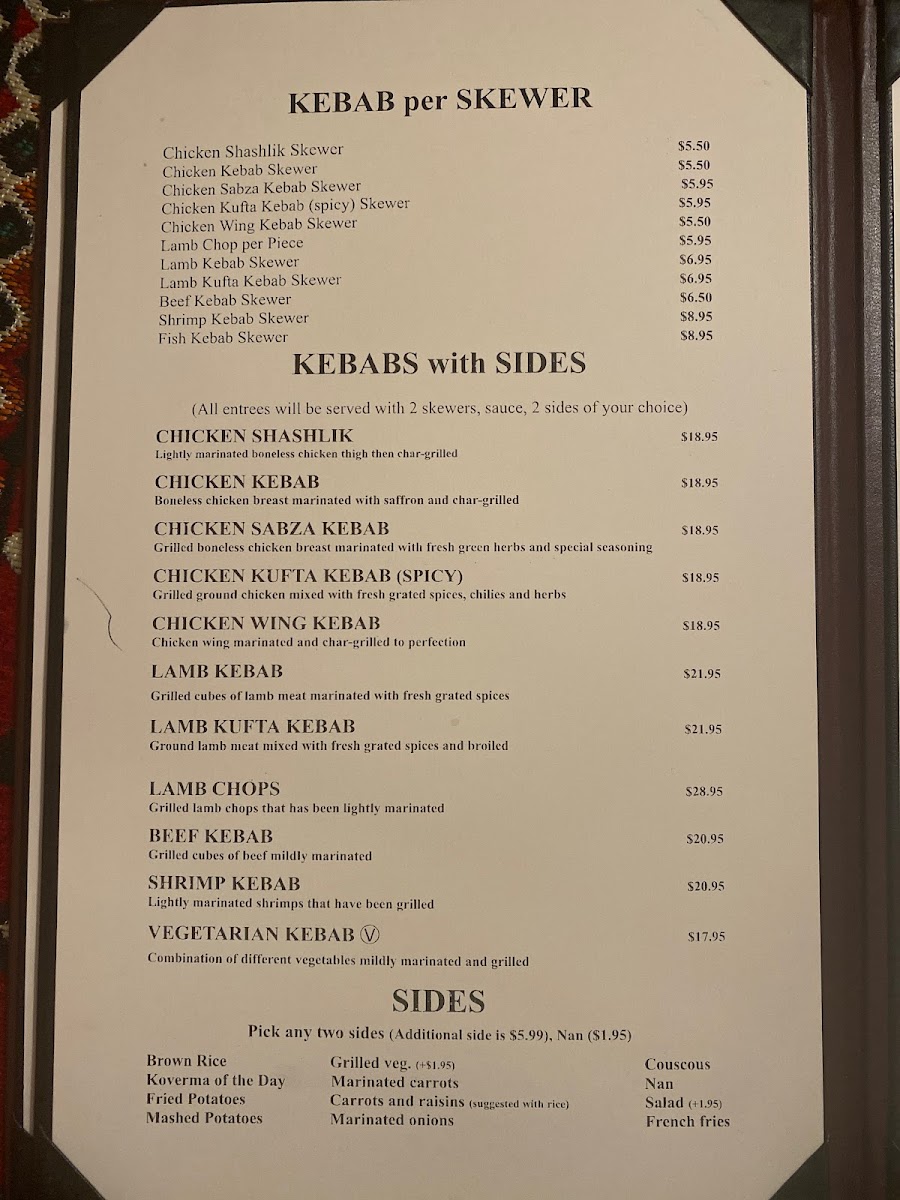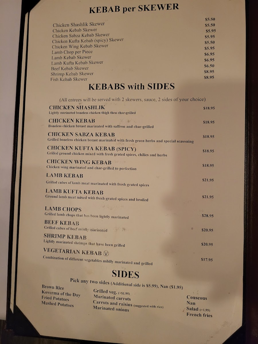 Two skewers of boneless special cut beef mildly marinated then broiled over charcoal. Served with sauces and rice or fried potatoes.